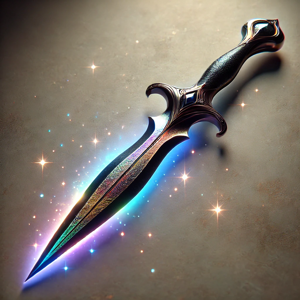 Dieser Dolch scheint aus einem dunklen, schimmernden Metall geschmiedet zu sein, das im Licht leicht irisierende Farben zeigt. Der Griff ist schlicht, doch perfekt ausbalanciert, und verströmt eine leichte Wärme, wenn er in der Hand gehalten wird.