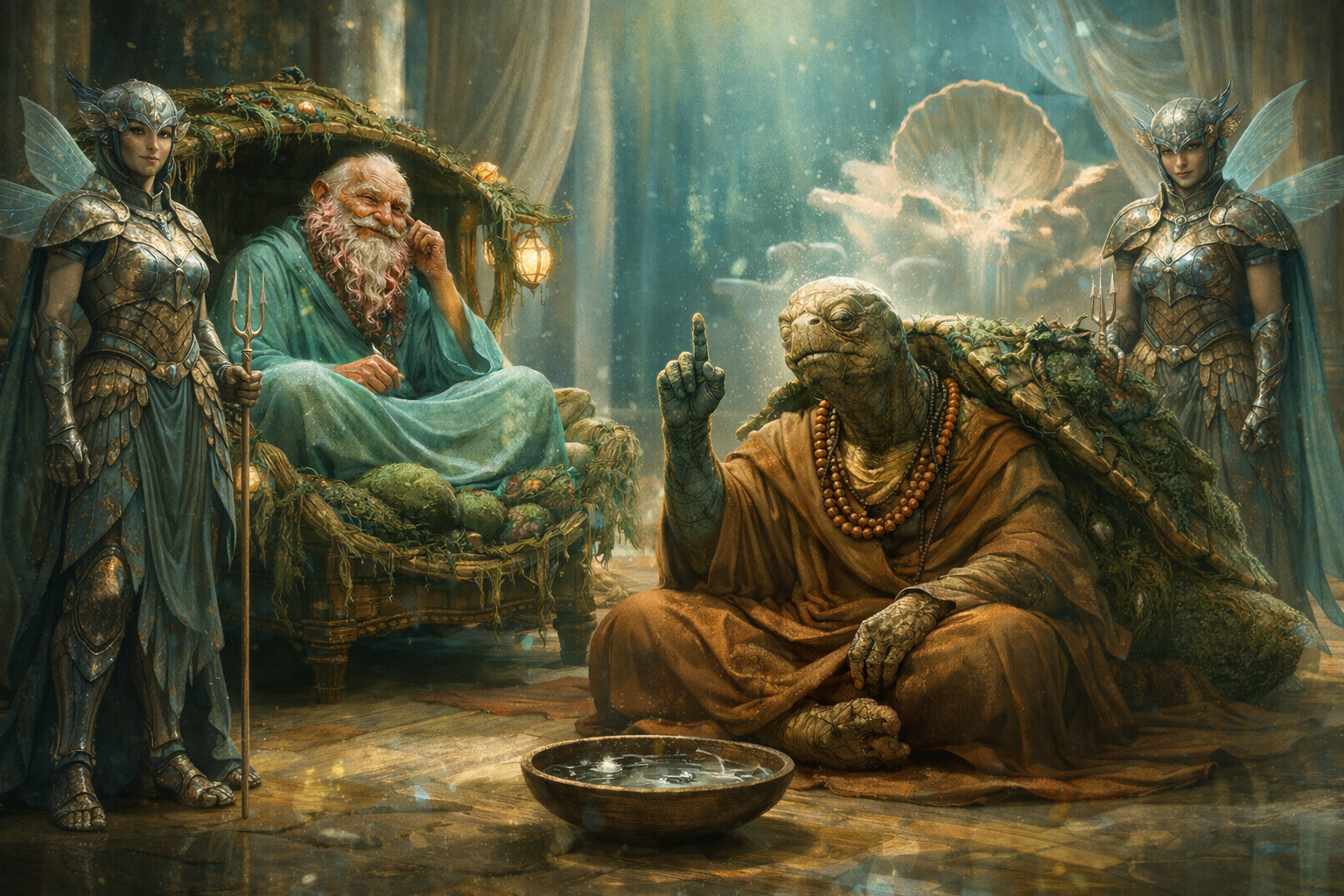 Der uralte Schildkrötenweise bewegt sich mit der Gelassenheit von Kontinenten. Sein Panzer trägt Algen, kleine Seepocken und die Spuren zahlloser Gezeiten. Seine Augen jedoch sind klar – tief wie Wasser, das kein Licht mehr kennt.
