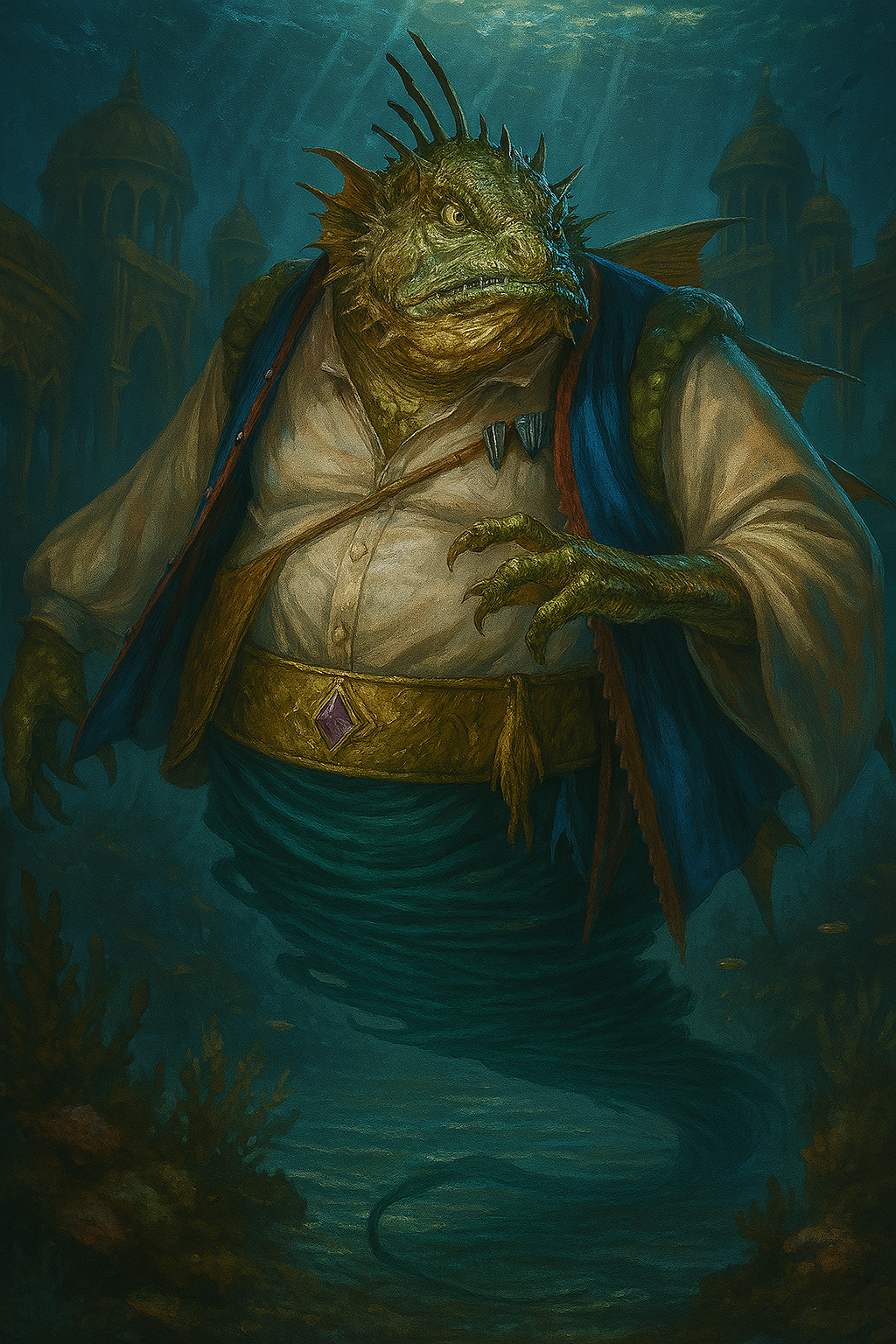 Breite Schultern spannen das Leinengewand, das er selbst in dieser Gestalt mit königlicher Selbstverständlichkeit trägt. Der Stoff treibt sanft im Wasser, darüber liegt ein schwerer, dunkelblauer Mantel, der an seinen Schultern wie ein Zeichen seines Amtes ruht. Ein breiter goldener Gürtel umfasst seine mächtige Taille; in seiner Mitte ruht ein violett schimmernder Edelstein, der das Licht der Umgebung einfängt wie ein gefangenes Leuchten aus der Dämmerzone.