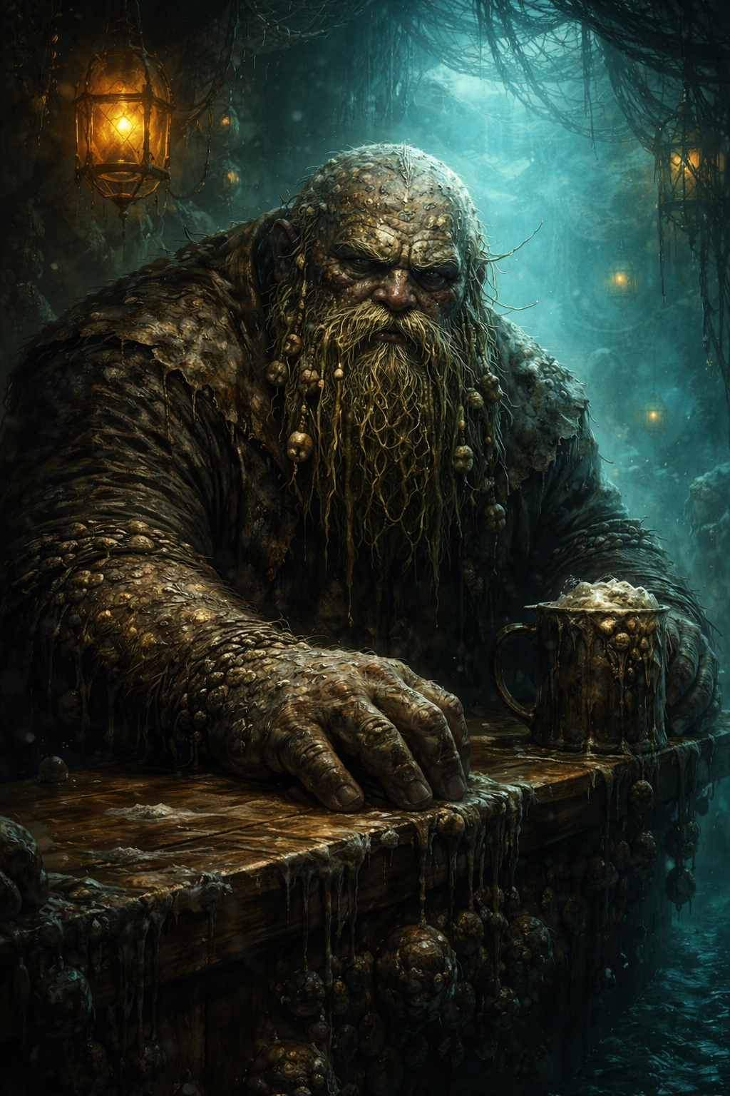 Ein zerfurchtes Gesicht mit stumpfen Augen, die schneller rechnen, als man erwartet, und ein Bart aus drahtigen Algen, in dem kleine Knochenperlen stecken – alte Glücksbringer, die längst nichts mehr bringen.