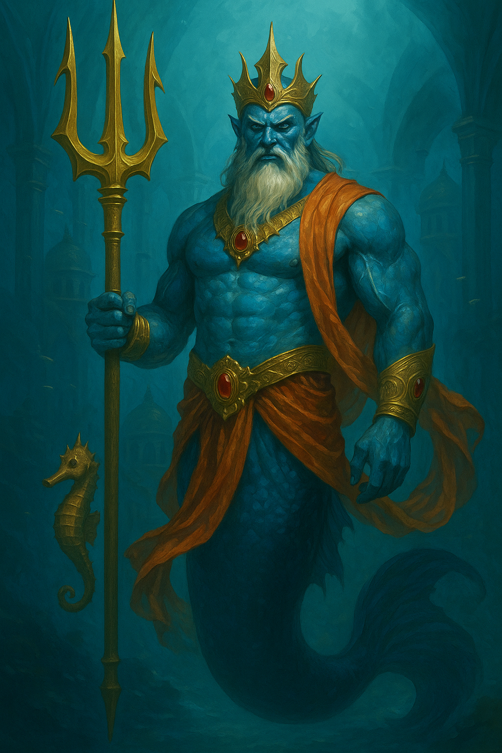 Sein Körper ist dann halb humanoid, halb fließend – seine untere Hälfte verliert sich in einem Strudel aus lebendigem Wasser, das sich wie Rauch in die Umgebung auflöst. Sein Kopf gleicht dem eines uralten Tiefseefisches, mit stachelartigen Auswüchsen und wachsamen Augen, die von Jahrtausenden der Herrschaft zeugen. Seine Kleidung ist edel: ein weißes Gewand, darüber eine tiefblaue Weste mit goldenen Verzierungen, und ein breiter Gürtel mit einem leuchtenden, magischen Juwel. Symbole der Macht und Weisheit zieren seine Brust.
