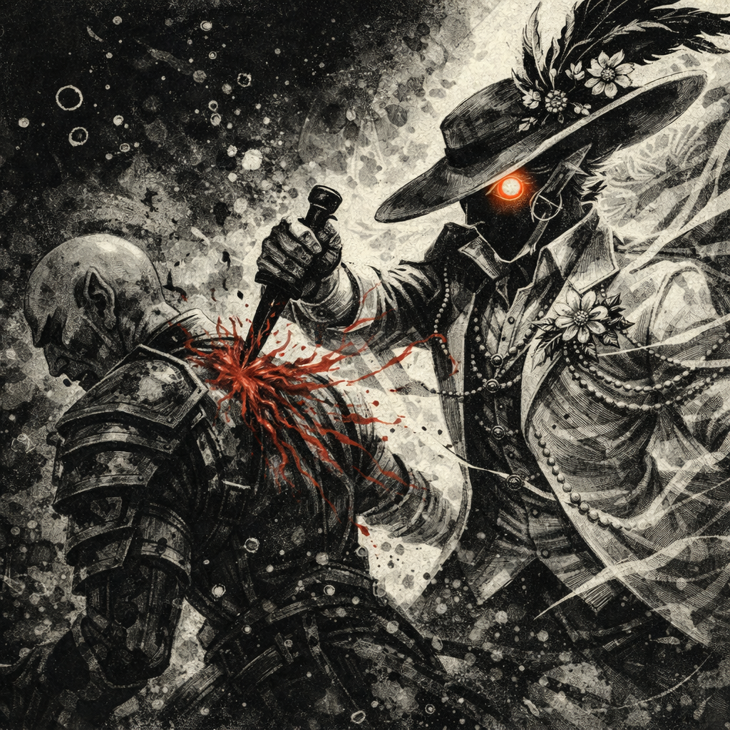 Surugeta Kyūkaku schwankte kurz, als eine weitere Welle des Kampfes an ihm vorbeibrauste. Dunkles Blut löste sich von seinen Wunden und trieb in schweren Schleiern davon.