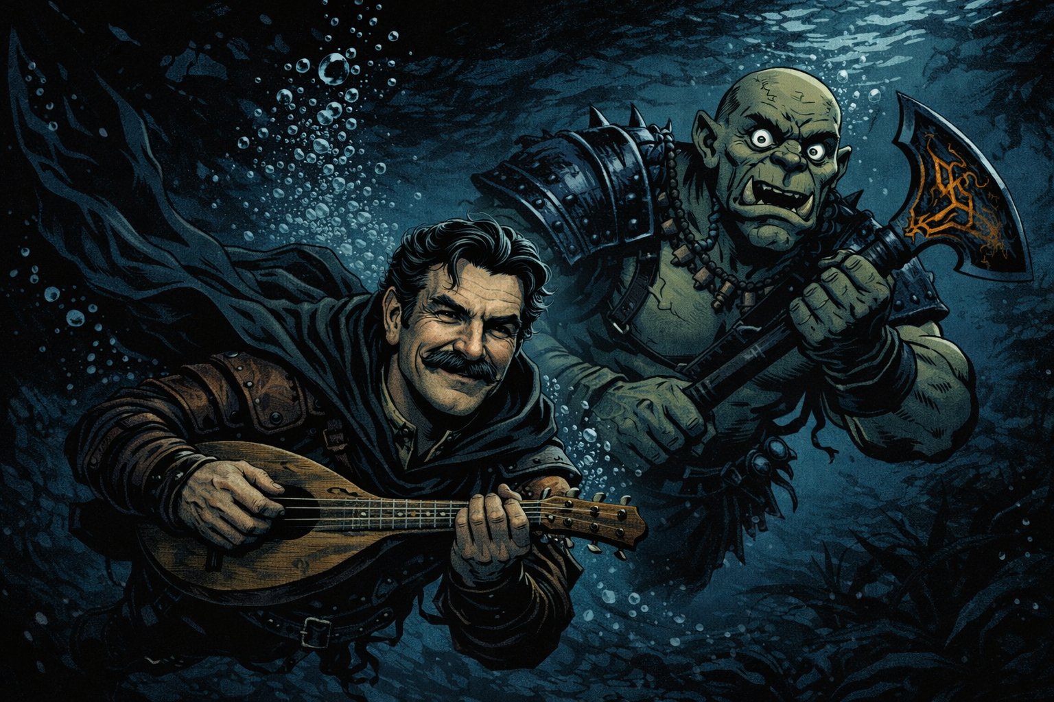 Finn hielt kurz inne und strich mit den Fingern über die Saiten seiner Laute. Der Ton, der entstand, klang dumpf und fremd, als würde selbst die Musik hier unten zögern zu existieren.