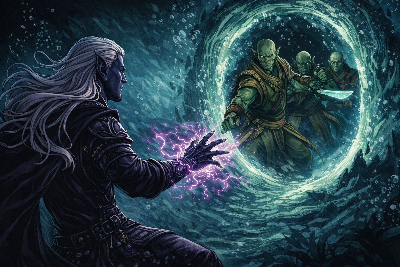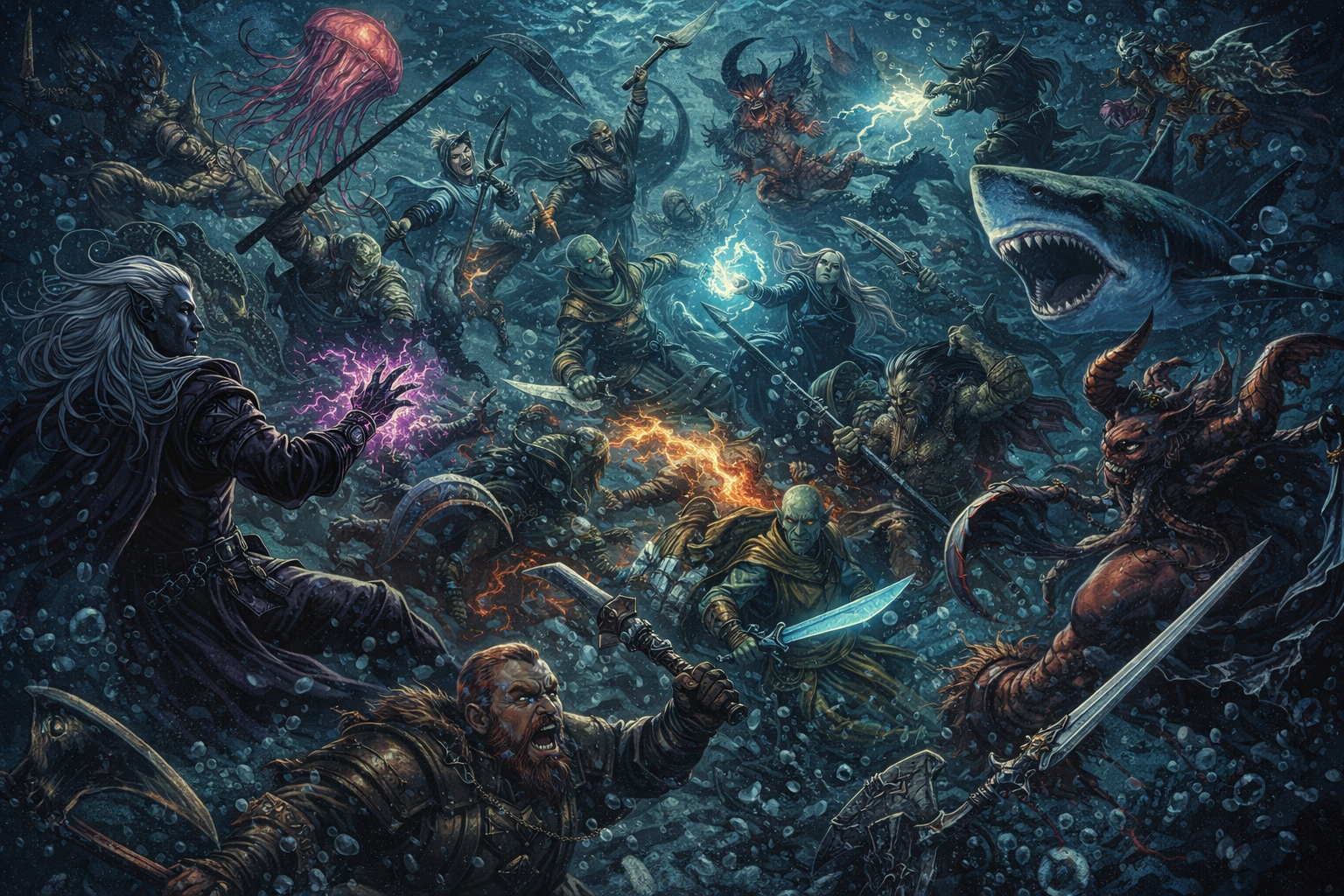 Formationen bewegten sich durch das trübe Wasser — Schatten, die aufeinanderprallten, auseinanderstoben, sich neu formierten. Stahl blitzte. Magie zerriss die Dunkelheit in kurzen, grellen Stichen.