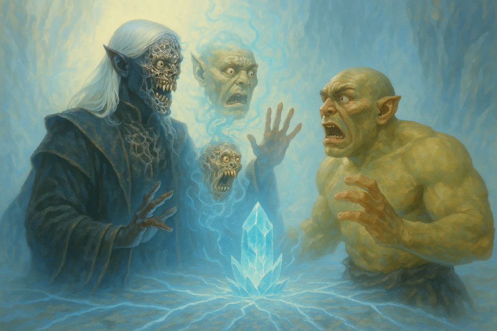 Xalfein trat näher. Mit einem leisen Wispern ließ er seine Gestalt zerfließen – sein Gesicht wurde zu einer Fratze aus Albträumen, einer wabernden Masse aus Angst, Zähnen und Leere. Er blickte den Ork an und Kleschbumtauchs Augen weiteten sich. Er schrie, fiel rücklings zurück, löste sich vom Kristall, bebend, keuchend, verwirrt.