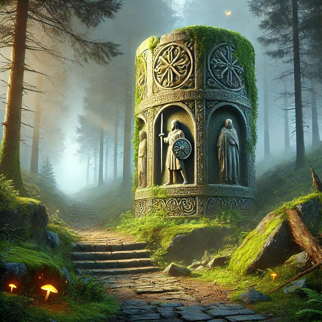 Als sie etwa die Hälfte des Weges umrundet hatten, blieb Fenro abrupt stehen. „Dort.“ Er deutete mit dem Kinn auf eine zweite Steinsäule, die sich wie ein stiller Wächter am Wegrand erhob.