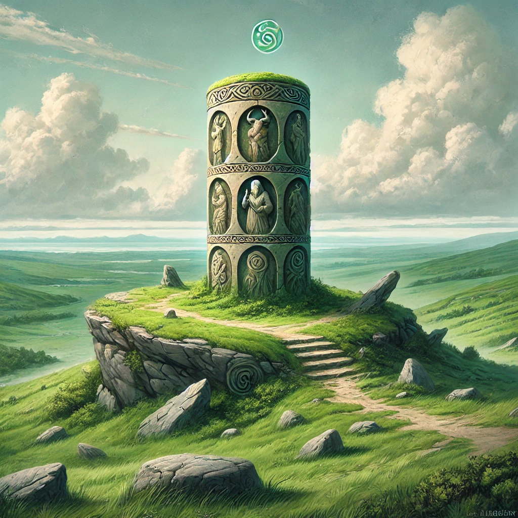 Der Weg krönte sich in einer weiten, offenen Kuppe – die Spitze des Hügels, wo das Licht des wandelnden Mondes in fließendem Gold den Boden küsste und die Luft seltsam schwer wirkte, wie kurz vor einem Sommergewitter. Hier, genau in der Mitte, stand sie: die dritte Säule.