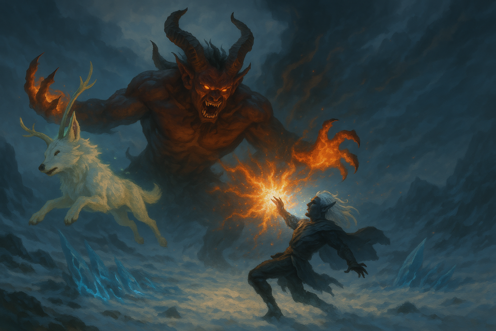 Unterdessen, am Rande der Lichtung, suchte Fenro Deckung zwischen kristallinen Eisformationen. Als der Tiefling einen gleißenden Energiestrahl auf Habikan schleuderte und dieser nur knapp ausweichen konnte, war es Fenro, der sich bewegte – schnell, lautlos wie ein Tier. Doch während er zur Seite rollte, glitt seine Hand über eine der leuchtenden Kristalladern.