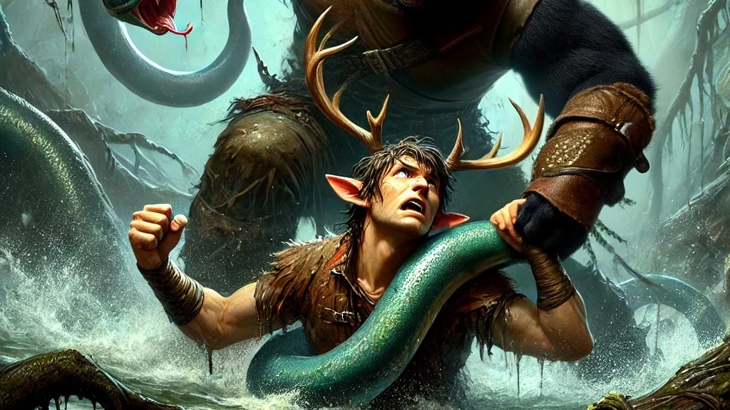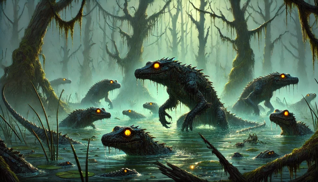 Ohne Vorwarnung schossen dunkle Silhouetten aus dem trüben Wasser. Lange, schlanke Körper, die sich mit erschreckender Geschwindigkeit durch den Morast bewegten. Gelbe Augen blitzten auf, und dann – ein tiefes, kehliges Knurren.