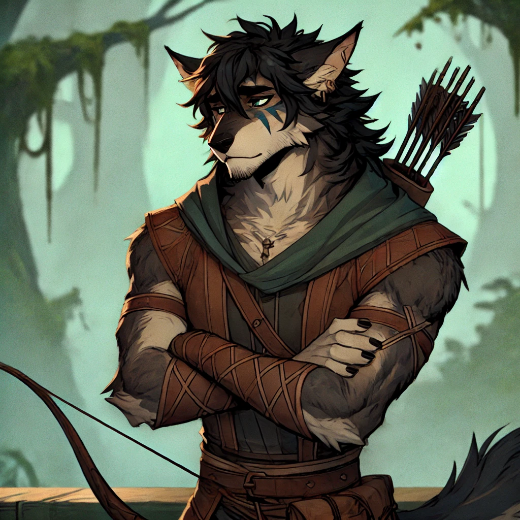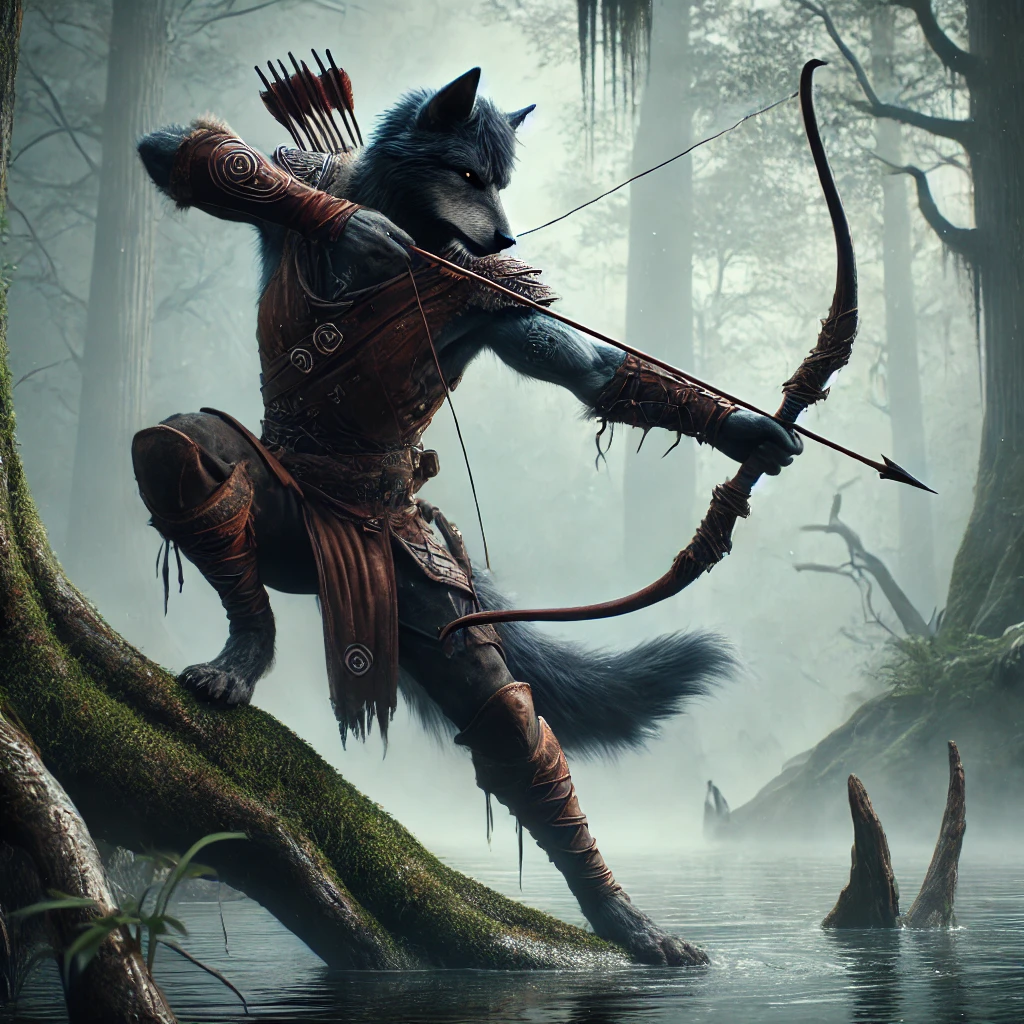 Fenro zog seinen Bogen, seine scharfen Augen suchten ein Ziel. Ein Sumpfhund schlich sich durch das Unterholz, bereit, sich auf Tharion zu stürzen – doch Fenro war schneller.