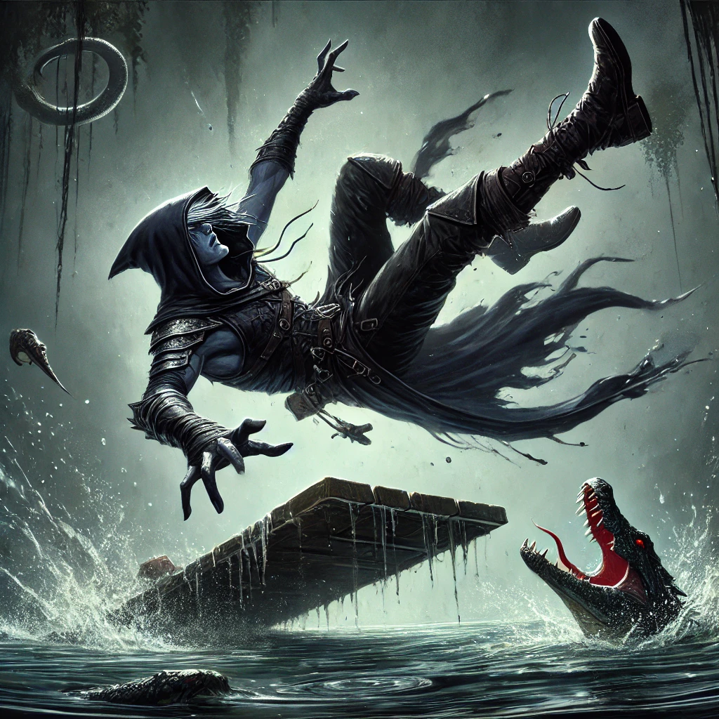 Auf der Plattform neben Finn zischte Xalfein einen Fluch, als einer der Sumpfhunde plötzlich mit voller Wucht gegen ihn sprang. Die Wucht war zu stark – der Dunkelelf verlor das Gleichgewicht.