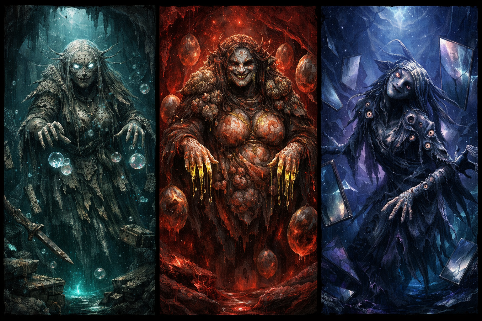 Ein Becken aus metallisch schimmernder Flüssigkeit lag vor ihnen, so glatt, dass es wie ein Spiegel wirkte. Darin erhoben sich drei Gestalten – See-Elfinnen, deren Oberkörper aus der Oberfläche ragten. Schwarzes, rotes und blondes Haar fiel wie lebendige Schleier über ihre Schultern und verbarg ihre Blöße. Ihre Augen jedoch waren weit aufgerissen, voller Angst.