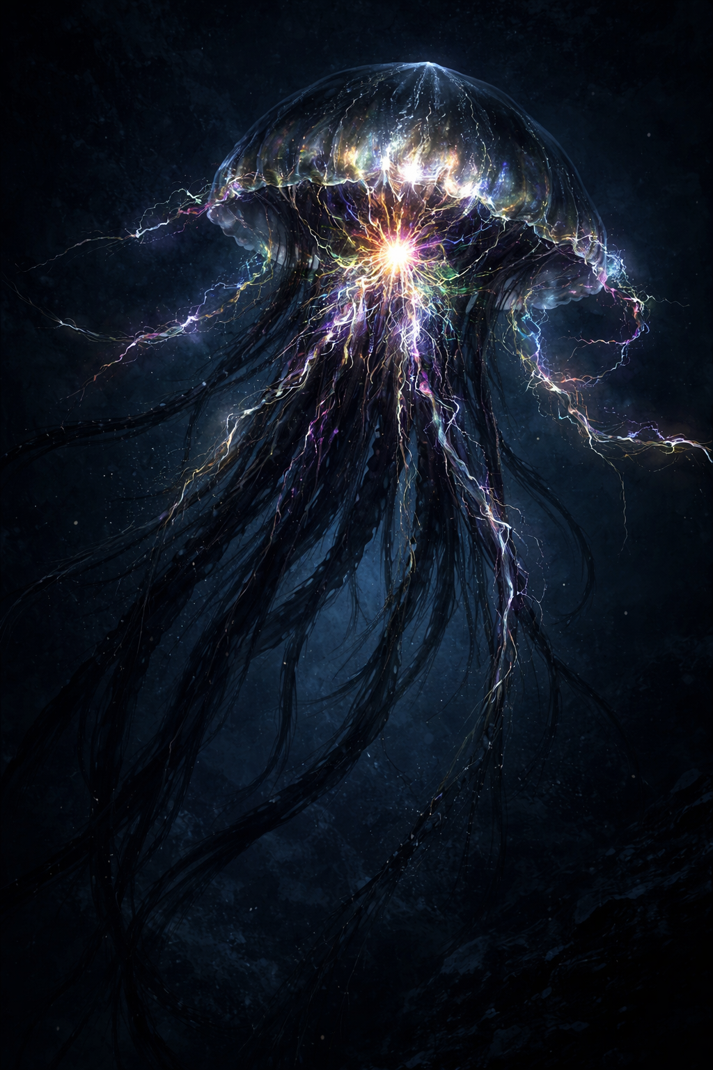 Links davon schwebte Niméa die Lauscherin. Ihr Körper war nicht humanoid und mehr Andeutung als Form, eine Silhouette aus schwarzem Licht und durchscheinender Tiefe. Fäden zogen sich hinter ihr her, pulsierend, langsam, wie Gedanken, die Zeit brauchten. Ein Gesicht war nicht erkennbar.
