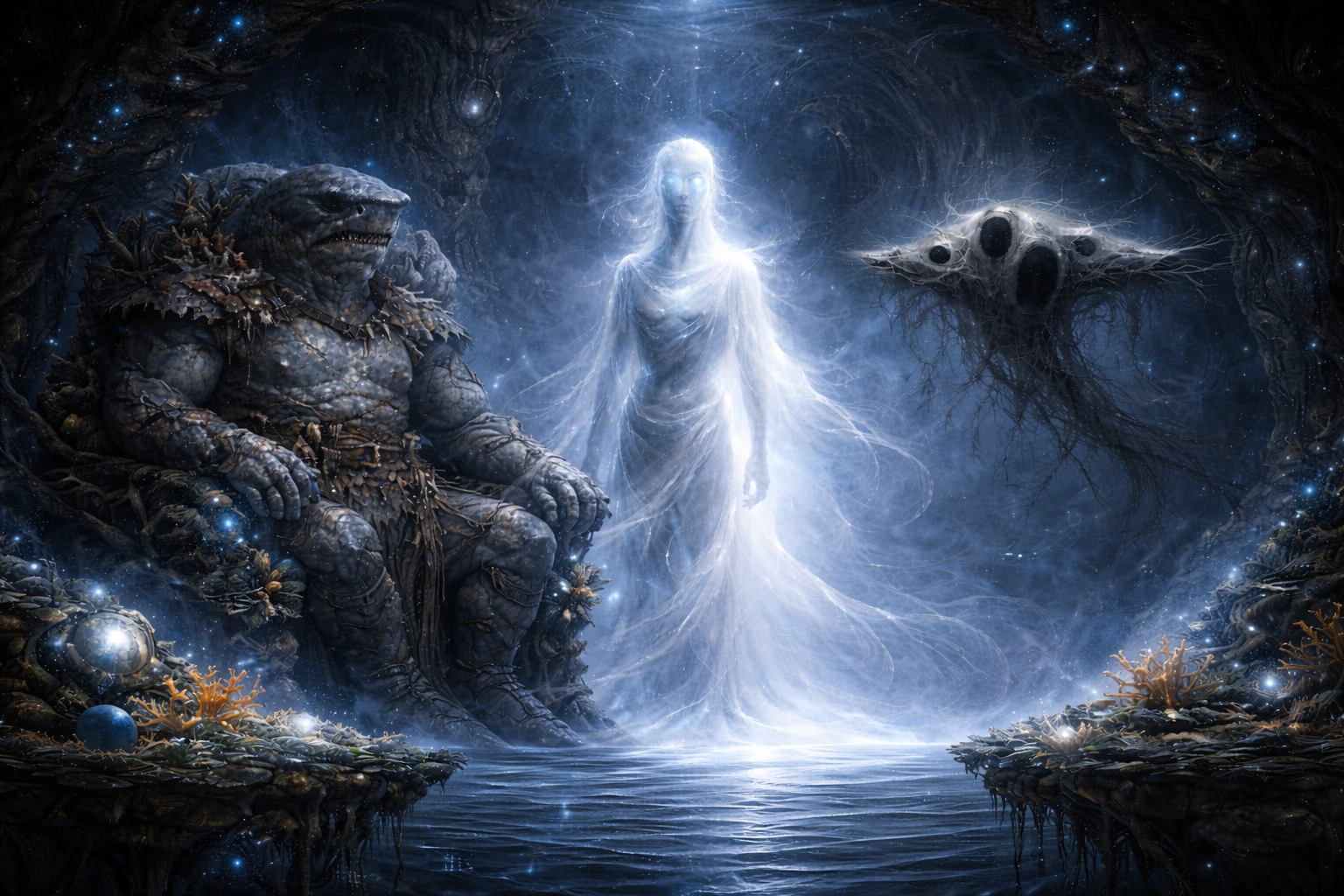 Selyr schwebte im Zentrum. Seine Gestalt war schlank, halbtransparent, als bestünde sie aus ruhigem Wasser und feinem Nebel zugleich. Seine Gesichtszüge waren glatt, beinahe zu glatt, und seine Augen wirkten wie stehende Wirbel – nicht bedrohlich, aber unerbittlich aufmerksam.