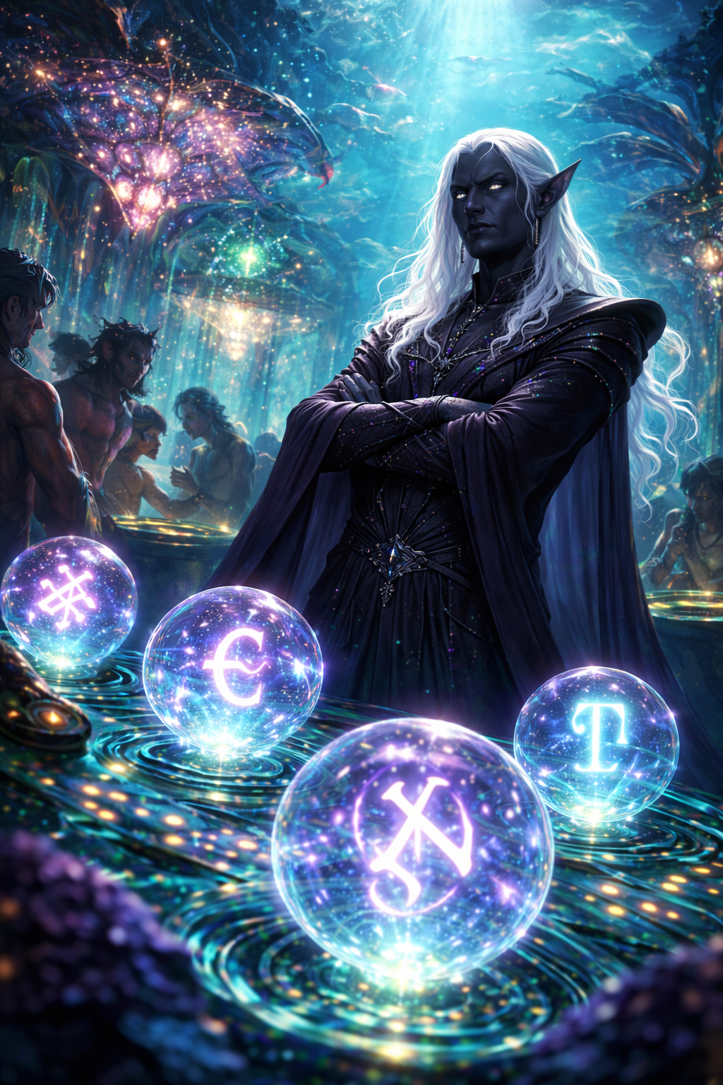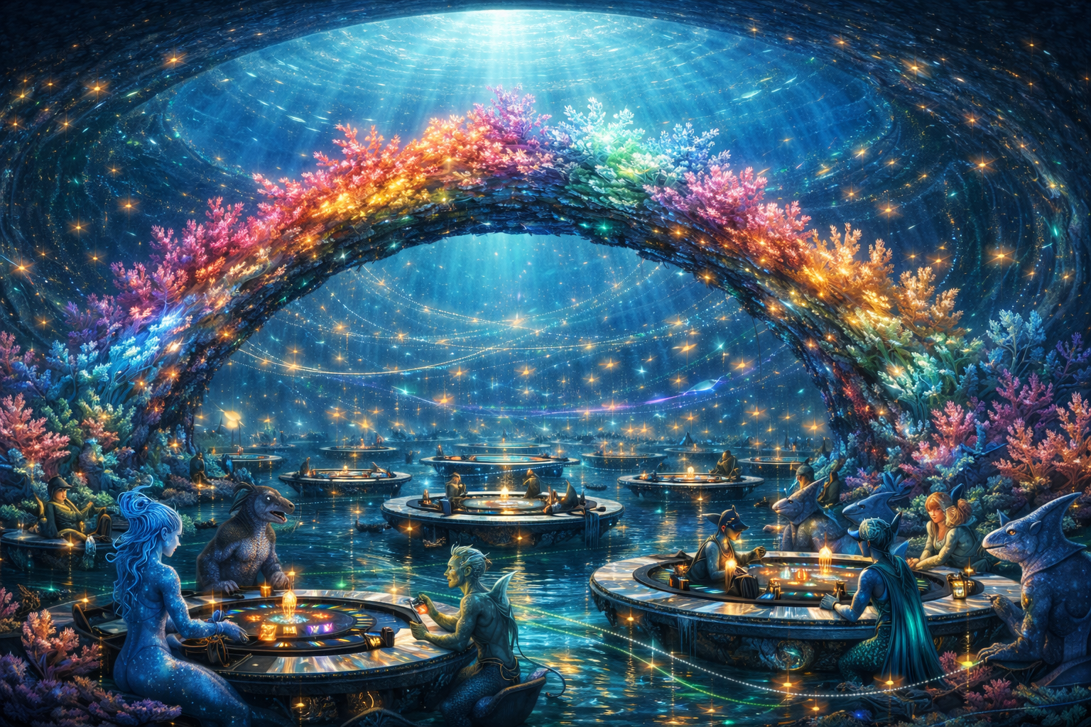 Das Casino war kein Gebäude im herkömmlichen Sinn. Schon der Eingang wirkt wie eine Einladung: ein weiter Bogen aus lebender Koralle, deren Farben langsam wechseln, als würden sie Atem holen. Sobald man eintritt, fühlt sich das Wasser wärmer an, weicher, und die Strömung ordnet sich unauffällig so, dass man immer weiter hineintreibt. Der Spielsaal ist eine riesige, kuppelförmige Halle, in der schwebende, runde Spieltische aus Perlmutt und schwarzem Stein kreisförmig angeordnet sind. Überall ziehen feine Lichtfäden durch das Wasser, biolumineszente Strömungen, die Einsätze markieren, Gewinne auszahlen oder Schulden still festhalten. Kein Geräusch ist laut, doch alles ist präsent: das leise Klacken von Runen, das sanfte Pulsieren von Magie, gedämpftes Lachen, das zu lange nachhallt.