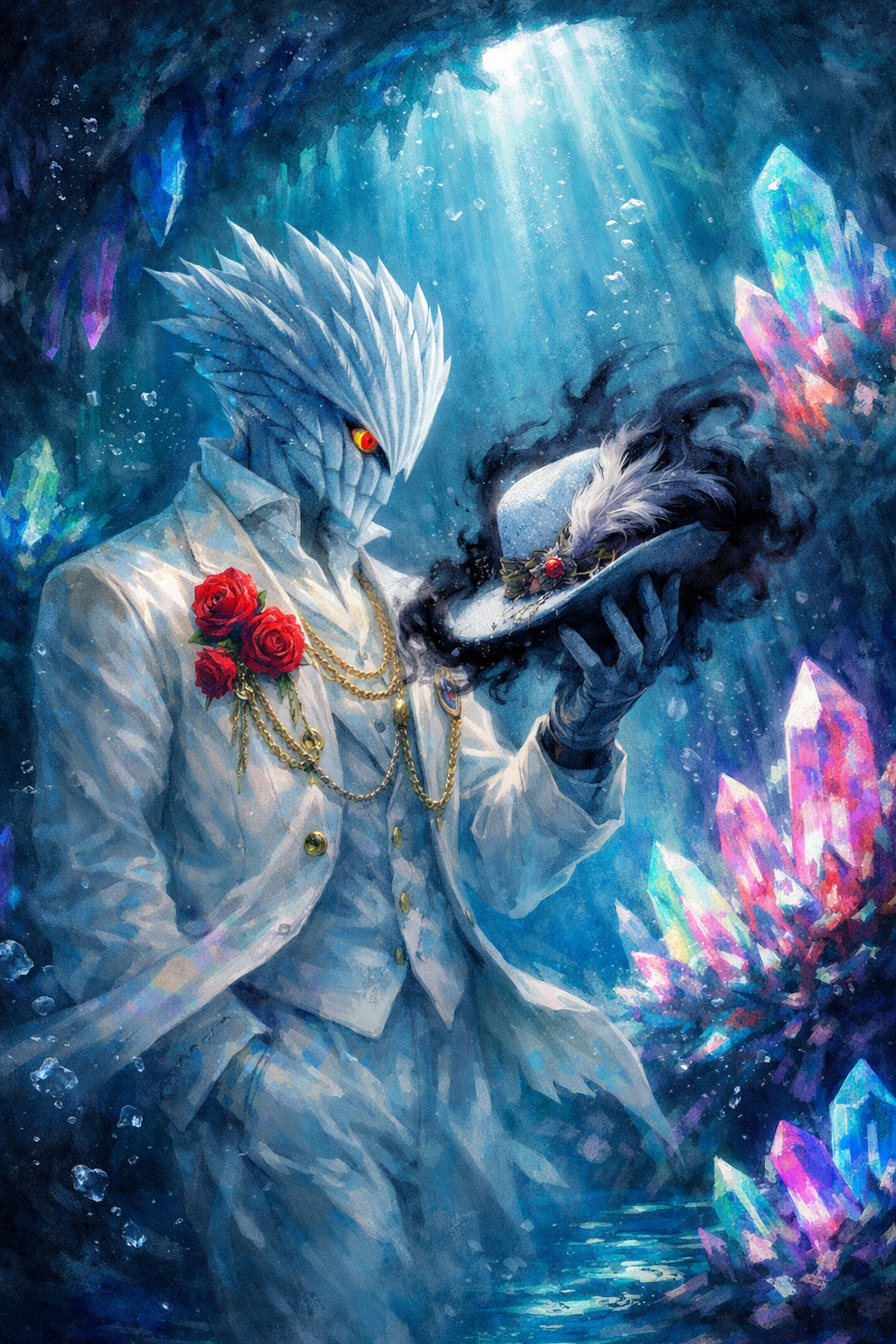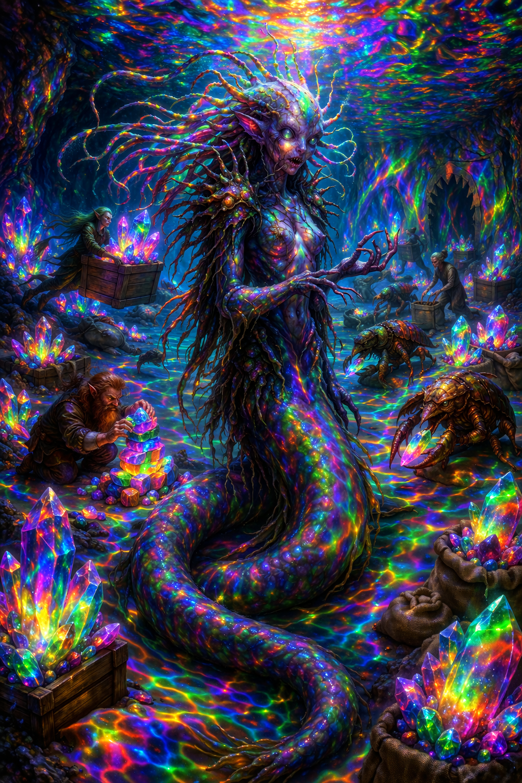 Ihre wahre Form verschwamm im schillernden Chaos der Kristalle, als würde die Realität selbst Schwierigkeiten haben, sie eindeutig darzustellen.