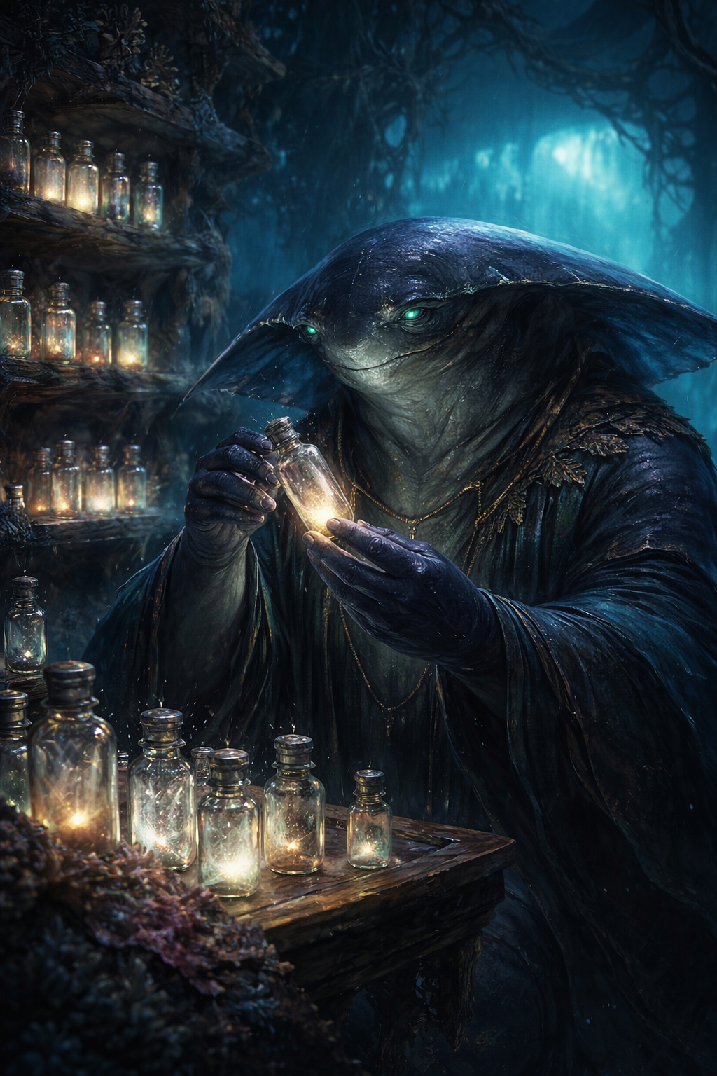 Sein nächster Halt führte ihn zu Ilyra von der Treibenden Strömung. Ihr Haar schwebte wie Seegras im ewigen Fluss, ihre Augen schimmerten silbern.