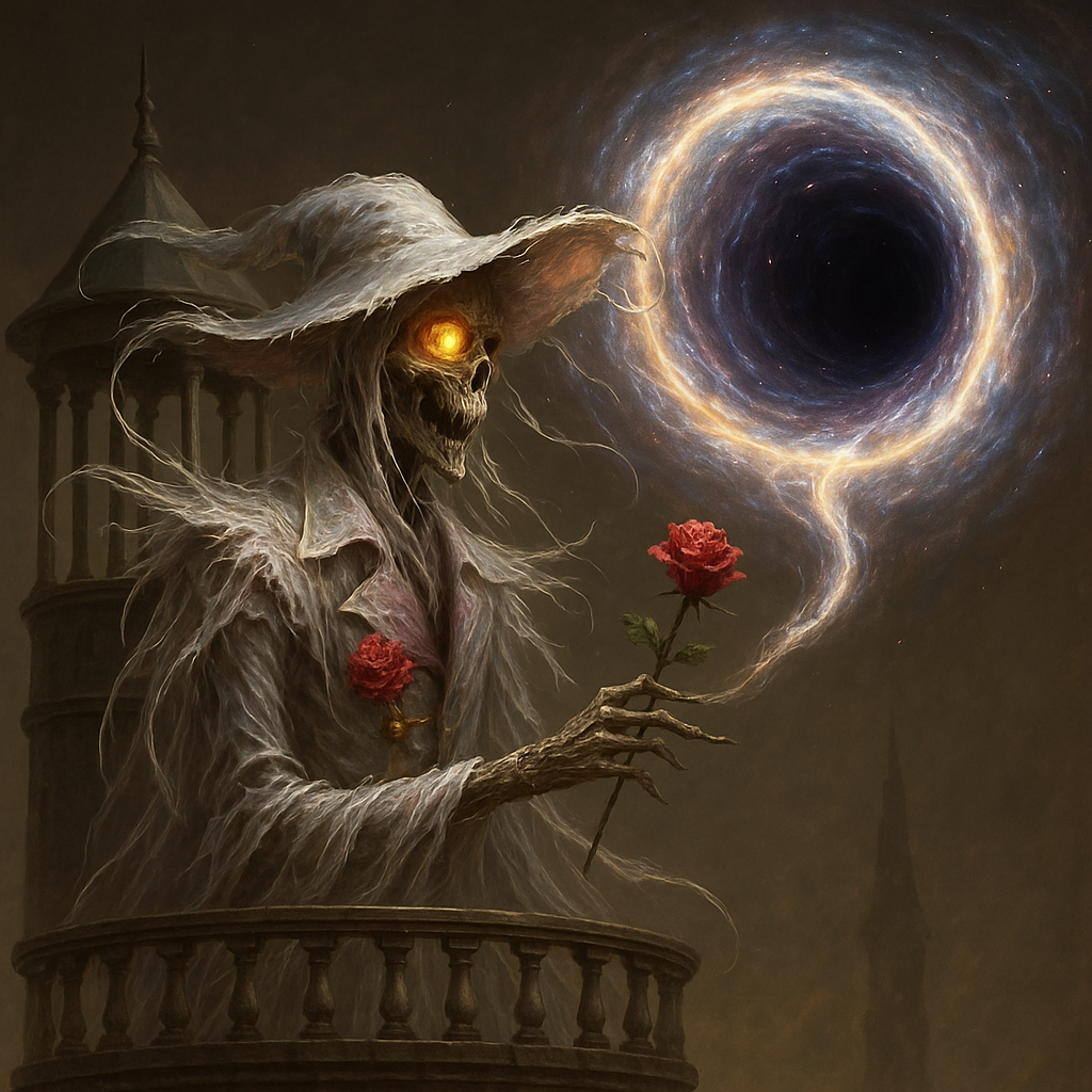Mit einer einzigen, fließenden Bewegung drehte er die Blume zwischen seinen Fingern. Ihre Dornen bogen sich, ihre Blätter entfalteten sich – und zwischen den beiden Türmen entstand ein Riss im Raum, eine Brücke aus flüchtigem Licht. Eine Einstein-Rosen-Brücke, geschmiedet aus Vergänglichkeit und Wille.