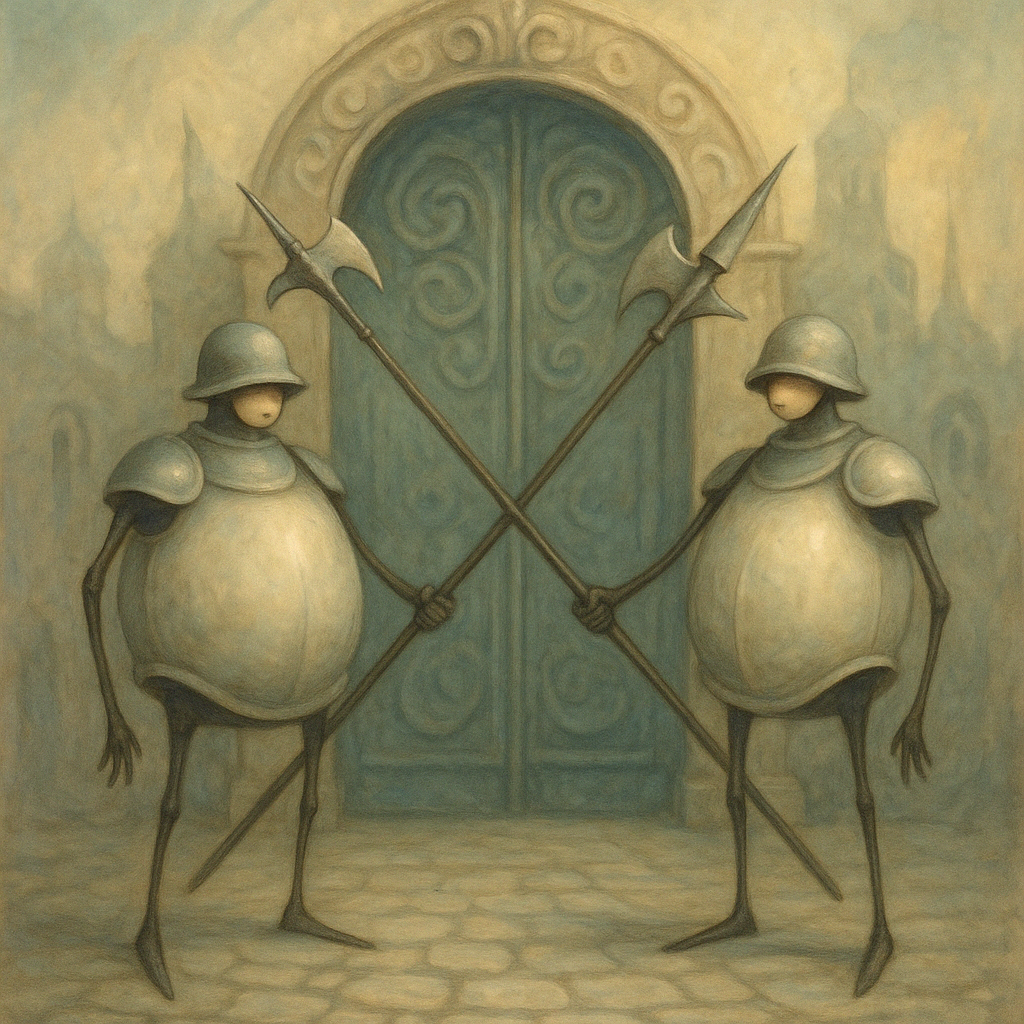 Trotzdem setzte er einen Fuß vor den anderen – mit jener träumerischen Anmut, die seine Bewegungen stets auszeichnete. Vor ihm erhob sich das große Tor, flankiert von zwei… Wachen? Oder waren es Möbelstücke, die beschlossen hatten, aufzustehen?