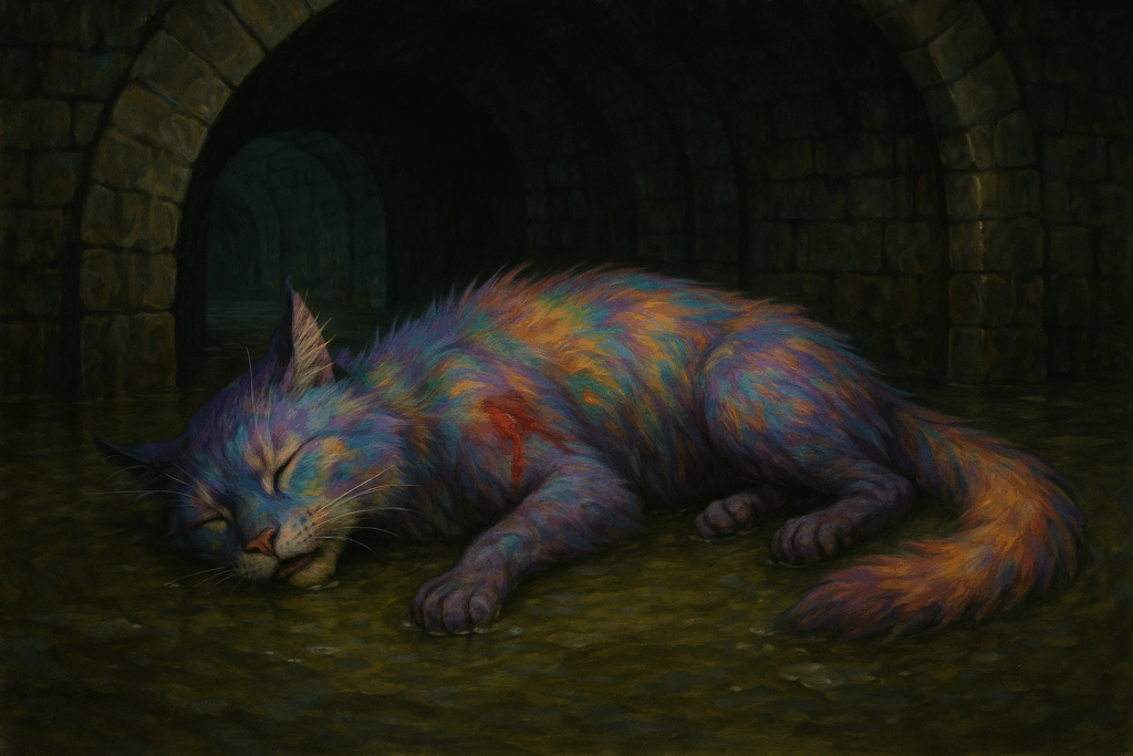 Doch auf dem Hauptfeld des Kampfes wendete sich das Blatt. Fuzz, Posys treuer Kater, hatte sich mit fauchender Wildheit in das Gesicht eines Kuo-Toa gekrallt. Der Gegner schlug panisch um sich, bis eine Keule den kleinen Körper traf. Mit einem dumpfen Laut flog Fuzz in das knöcheltiefe Abwasser, wo er reglos liegen blieb. Posys Schrei hallte durch den Raum.