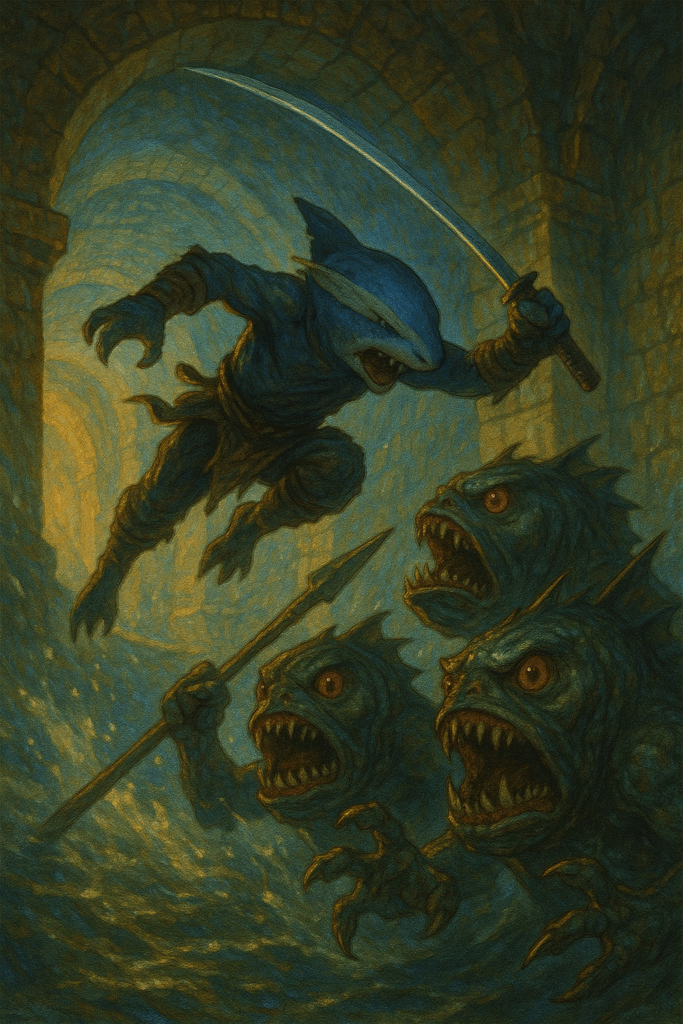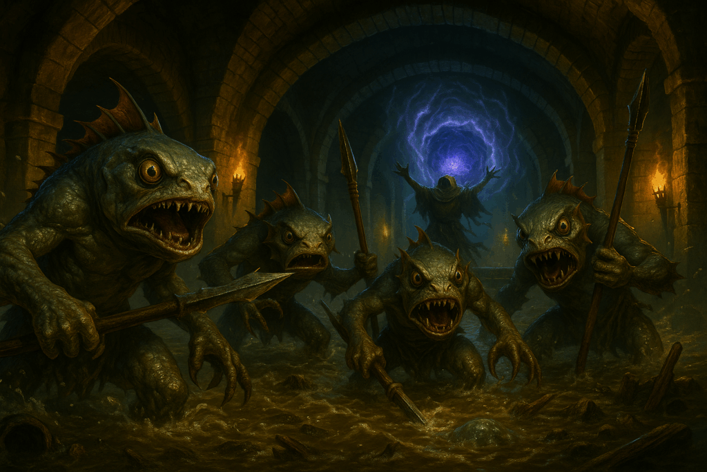 Unter dem Hall der Steingewölbe explodierte die Spannung in einem plötzlichen Aufeinandertreffen. Die Kuo-Toa stürmten aus ihrer Deckung hervor, ihre Schuppen glitschig, ihre Speere blitzend im fahlen Kristalllicht.