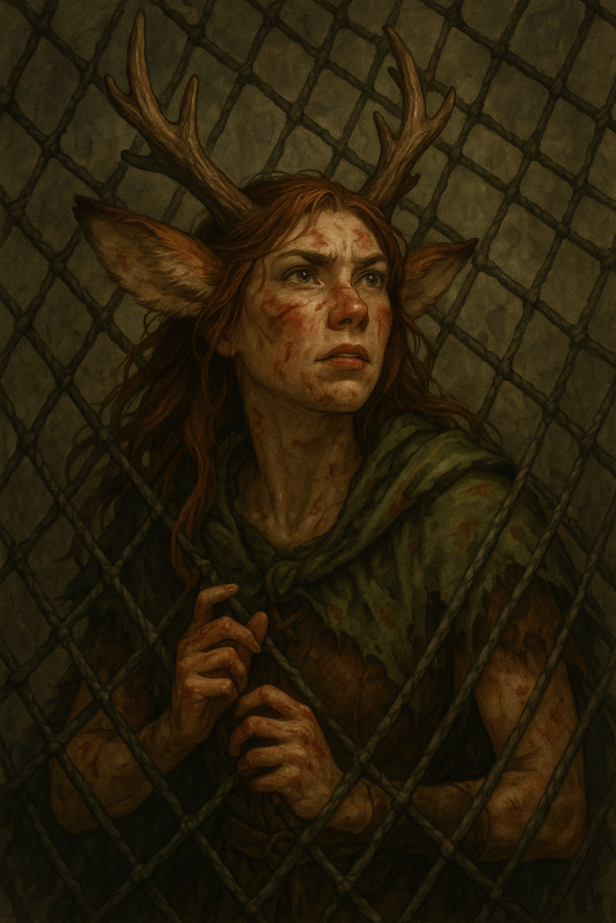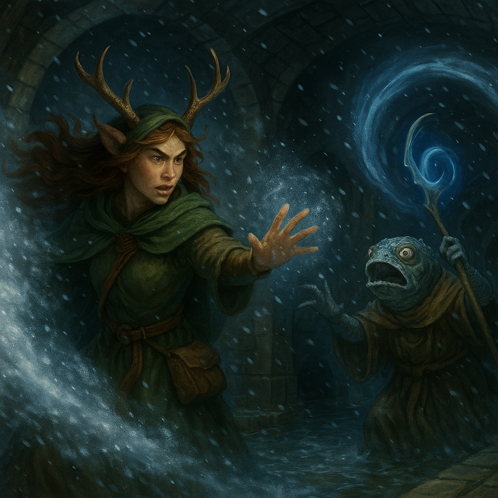 Sonea breitete ihre Arme aus, und ihr Körper löste sich in ein Geflecht aus Federn. Ihr Körper schrumpfte, ihr Gesicht wurde zum scharfen Schnabel einer Eule. Lautlos glitt sie über die Köpfe der Kämpfenden hinweg, bis sie die hintere Plattform erreichte. Dort landete sie hart, verwandelte sich zurück in ihre cervidische Gestalt und hob die Hände. Ein Sturm aus Schnee und Eis brach hervor, fegte über den zaubernden Kuo-Toa und seine Begleiter hinweg und ließ seine Runen flackern und verlöschen. Das entstehende Portal erstarb im Aufheulen gefrorener Magie.