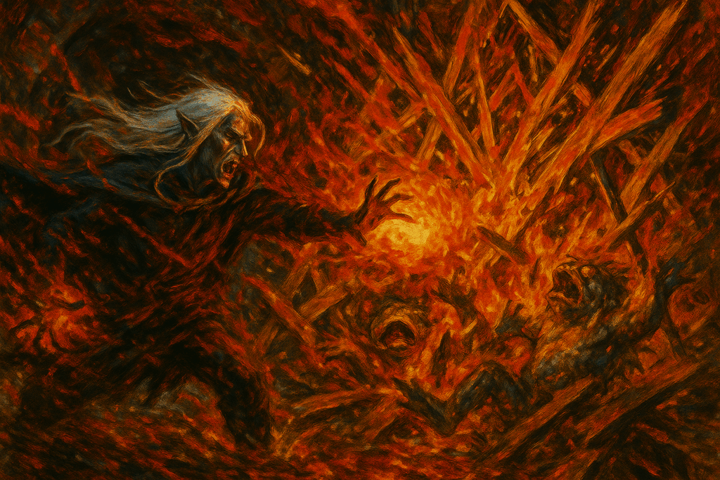 „Genug gespielt!“ rief Xalfein, seine Stimme triefend vor Sarkasmus und Zorn. Ein Funken sprang von seinen Händen, dann entfaltete sich ein Feuerball mitten in der behelfsmäßig errichteten Barrikade. Holz und Möbelteile sowie mehrere Kuo-Toa verwandelten sich in ein Inferno. Der Knall schleuderte Splitter durch den Raum, die Feuchtigkeit zischte im Feuer, und ein beißender Rauch breitete sich aus.