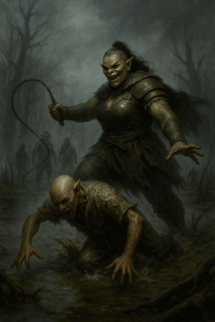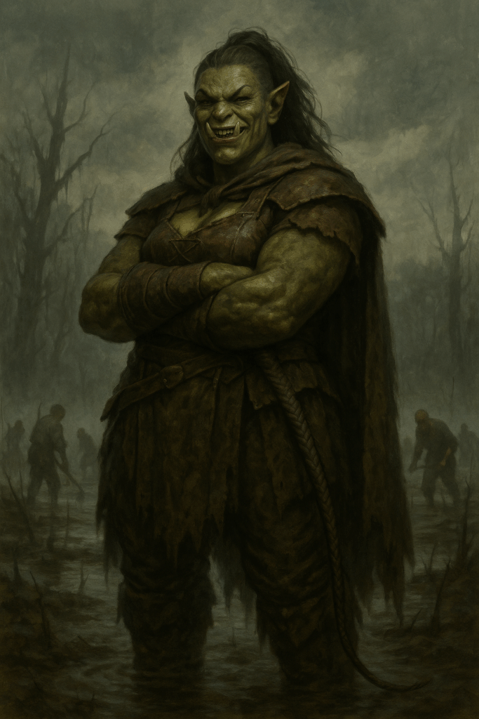 Um ihn herum schuften andere im Torf. Menschen, Orks, ein paar Goblins – ihre Gesichter ausdruckslos, ihre Bewegungen mechanisch. Niemand sprach. Die einzige Stimme gehörte der Vorarbeiterin – einer breitschultrigen Orkin mit wettergegerbtem Gesicht, lederner Rüstung und einer langen, geflochtenen Peitsche, die wie eine Schlange in ihrer Hand lebte.