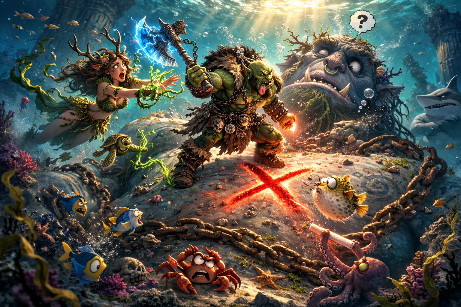 Das Wasser wurde dunkler, schwerer, dichter. Druck legte sich auf Brust und Glieder wie eine unsichtbare Hand. Selbst Finns leichtfüßige Bewegungen verloren an Eleganz, während seine Finger unbewusst über die Saiten der Laute glitten – ein leiser, vibrierender Ton, kaum mehr als Trotz gegen die Stille.