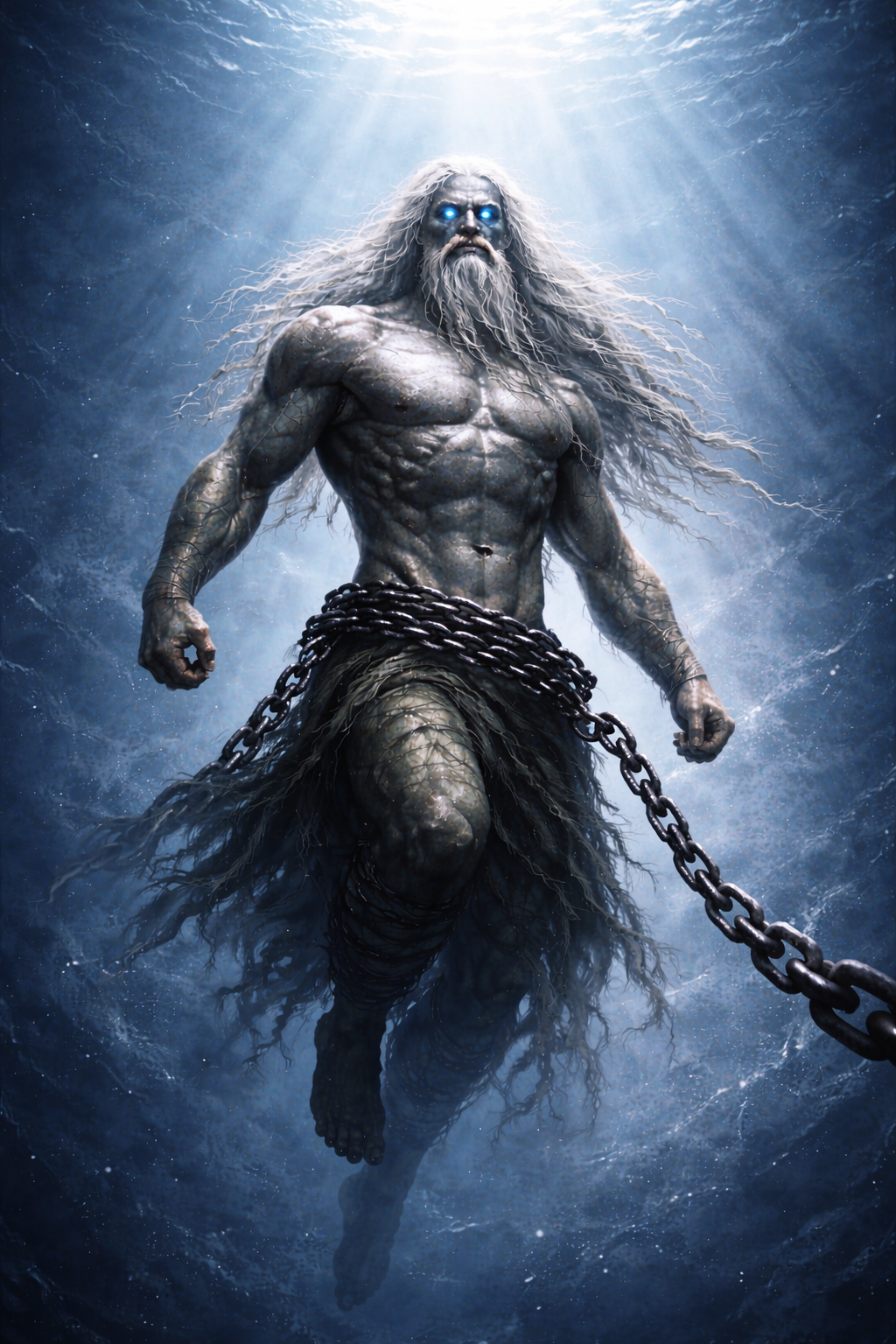 Sein Körper war gezeichnet vom Druck der Tiefe, doch noch immer gewaltig und muskulös. Schultern gesenkt. Kopf leicht nach vorn geneigt. Silbrig-graues Haar und Bart trieben langsam wie Seegras in träger Strömung. Seine Haut war blass, an manchen Stellen dunkel verfärbt, wo Metall sich in Fleisch gedrückt hatte.