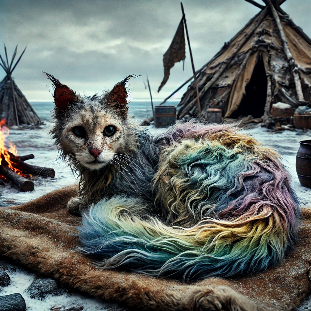 Der Winter war still hier. Nur wenig Schnee, aber das Gras war gefroren, und der Atem der Tiere hing schwer in der Luft. Posy fror. Sein Fell, einst dicht und glänzend, war schütter und grau geworden. Seine Muskeln, einst stolz zur Schau gestellt, zitterten unter der Kälte. Selbst sein treuer Begleiter Fuzz – sein Regenbogenfell längst ausgebleicht, die Bewegungen langsam und vorsichtig – lag zusammengerollt neben ihm, tief in einen groben Umhang gewickelt.