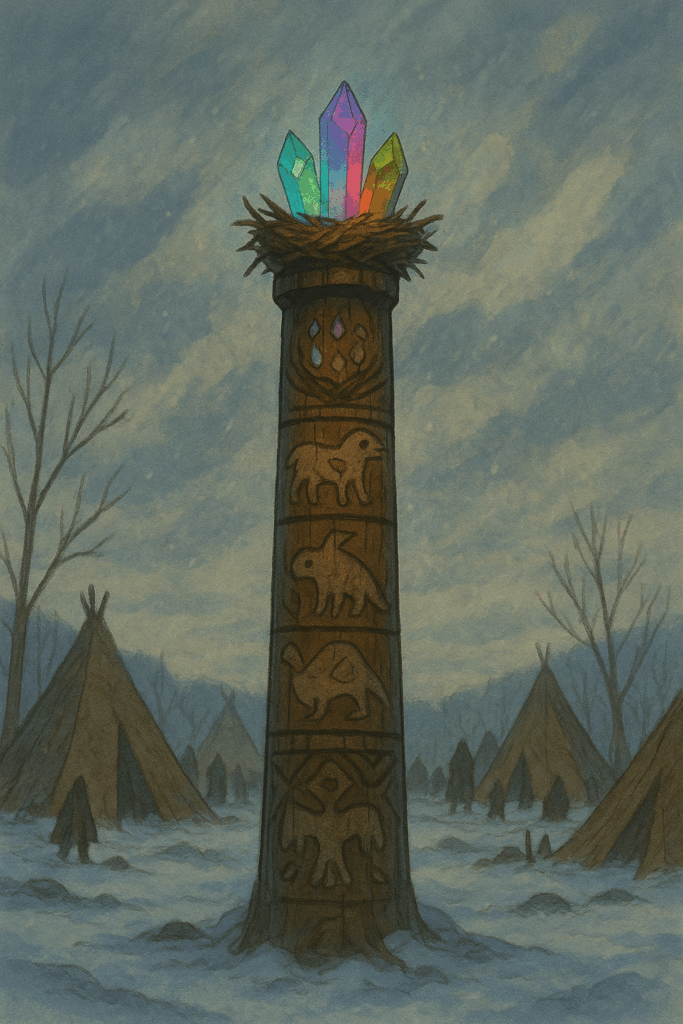 Dort ragte der Totempfahl in den Himmel – alt, geschnitzt, geschwärzt vom Wetter, von Moos umrankt. Und dort oben, ganz an der Spitze, verborgen vor aller Augen – aber nicht vor ihm – glimmte etwas. Wie gefrorenes Licht.