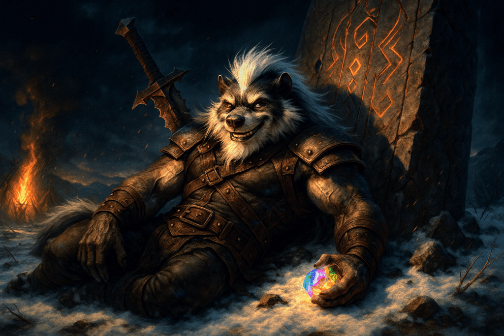 Das Feuer, an dem sie saßen, knisterte schwach. Es war keine große Flamme – mehr ein Überbleibsel aus der Nacht, das sich weigerte zu sterben. Eine junge Frau, kaum mehr als ein Schatten mit streifigem Fell, trat kurz an ihn heran. Sie reichte ihm eine dampfende Schale Brühe, legte ein raues, aber warmes Fell über seine Schultern – und verschwand wieder wortlos zwischen den Zelten.