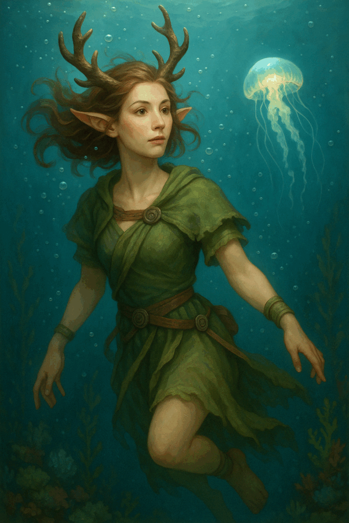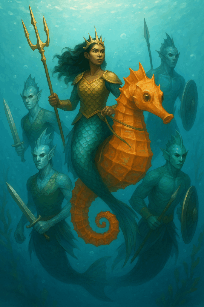 Während die fremdartigen Krieger sie abtransportierten, tauchte am Rande der Sicht eine zweite Gruppe auf – hochgewachsene Meereswesen mit schimmernden, schuppenverzierten Rüstungen und langen, elegant geformten Speeren. Ihre Bewegungen waren ruhig, beinahe feierlich. Ihre Augen – mandelförmig und leuchtend – blickten schweigend auf die Szene. Keine Geste, kein Laut. Kein Eingreifen.
