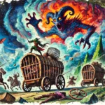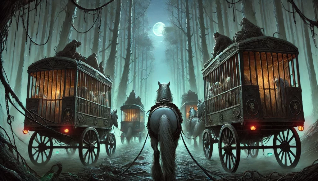 Die Dunkelheit des fremden Himmels hing schwer über ihnen, nur unterbrochen von der flackernden Beleuchtung der Fackeln, die an den Käfigwägen befestigt waren. Sie waren gefangen – die kalte Härte der Eisenstäbe ihrer Zellen und das monotone Rumpeln der Räder waren zu ständigen Begleitern geworden. Die Luft war durchdrungen von dem fernen Heulen des Windes und dem gelegentlichen Knarren der Wägen, während die Bewacher schweigend ihre Arbeit verrichteten.