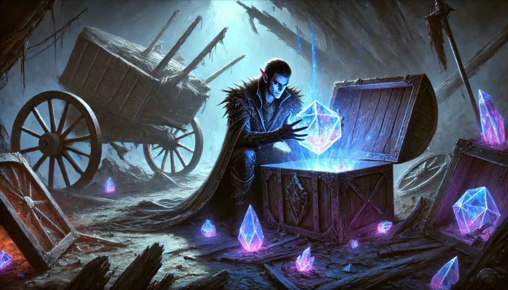 Inmitten des Chaos und der Stille, die auf den Kampf folgte, bewegte sich Xalfein, der Dunkelelf, mit der geschmeidigen Eleganz eines Schattens. Während die Aufmerksamkeit aller auf die gefallenen Kultisten und die verstörte Gruppe gerichtet war, glitt er unbemerkt in Richtung des zentralen Wagens. Dort, umgeben von Splittern und Trümmern, lag eine der Kisten, deren geheimnisvolle Aura selbst im schwachen Licht der Sonne pulsierte.